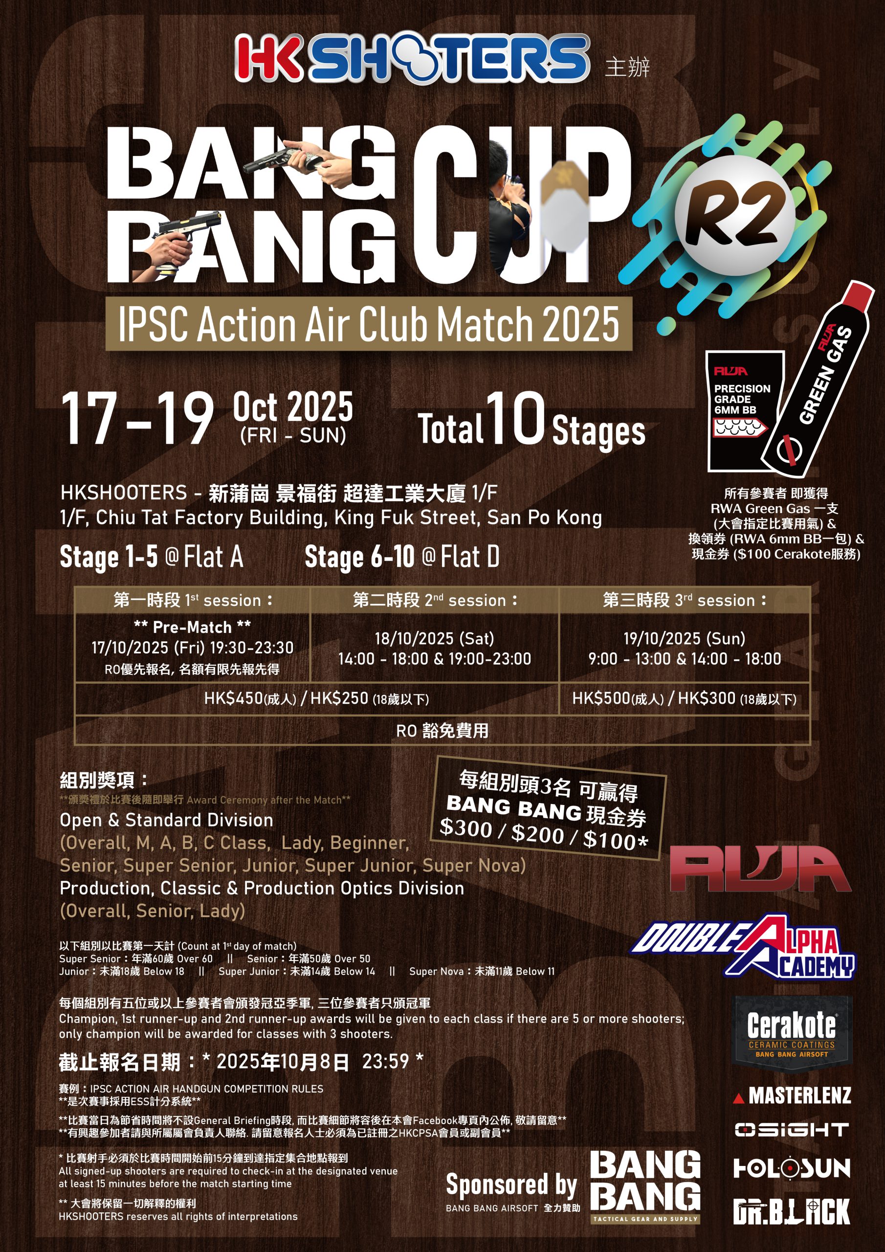 本會將於 2025年10月17至19日 舉辦 < BANG BANG CUP – IPSC Action Air Club Match 2025 Round 2 > 詳細資料如下: